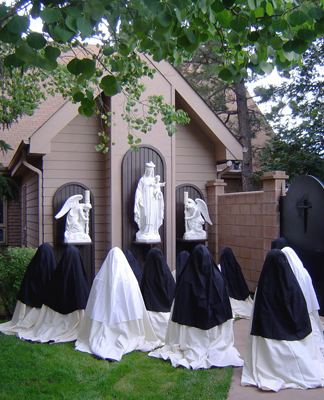 A certain freedom of soul is felt upon walking through the courtyard gate of the Carmelite monastery. Peace reigns here. When you pass through the doors of the monastery, you enter a world apart. The noise and values of the world have no place here. Here, as Carmelite nuns, we live our lives of poverty and silence, of prayer, penance and sacrifice for the world, hoping that the austerity of our lives would be acceptable reparation for the losses and sufferings of the Church and the ills of the world at large. The scope of our concern, then, is the whole world. The main “work” of the Carmelite is prayer. Our day begins early; we rise at 4:30 a.m. for the recitation of the Divine Office, followed by mental prayer and Holy Mass. A thinly veiled grille separates our choir, or monastic chapel, from the altar and public chapel. Here the priest celebrates Mass and administers Holy Communion to us through a small door in the grillework.