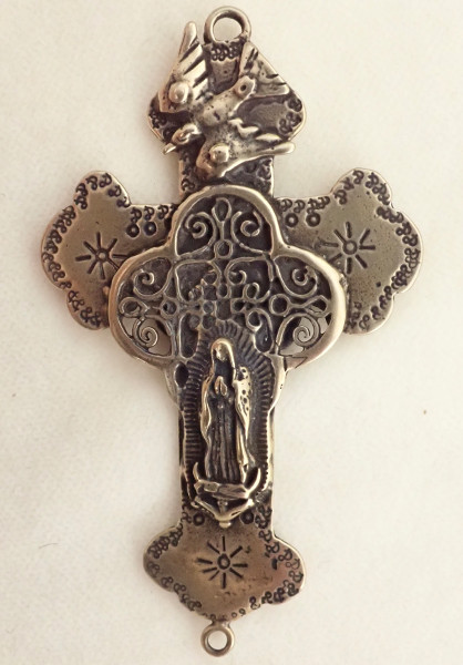 Ornate Salsa style cross with Our Lady of Guadalupe, the Holy Spirit (at the top), and a rose (on the back)